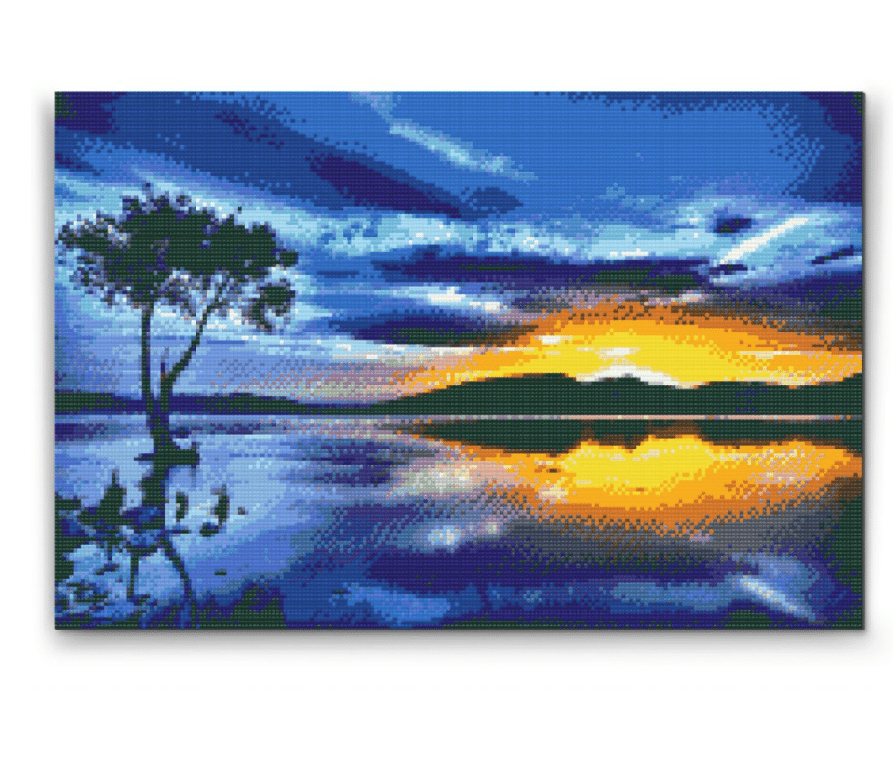 Flot diamond paint-billede af en solnedgang ved vandet.